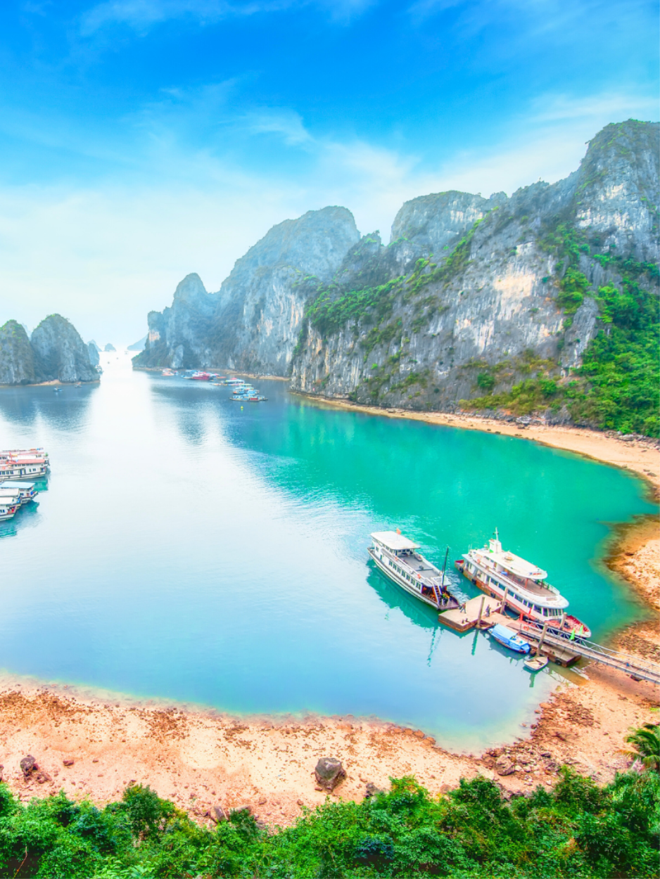 La baie d'Halong est une merveille naturelle splendide du Vietnam, caractérisée par ses montagnes karstiques imposantes et ses eaux cristallines. Vous aurez l'opportunité de faire des croisières à travers la baie, d'admirer des paysages époustouflants et d'explorer des grottes mystérieuses. C'est une destination idéale pour se détendre et profiter de la beauté naturelle exceptionnelle du pays.